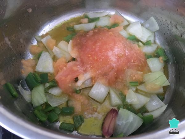 Incorporar el tomate rallado, poner sal, pimienta blanca y un poco de comino molido. Mover y dejar que se cocine durante 4 minutos a fuego suave.
