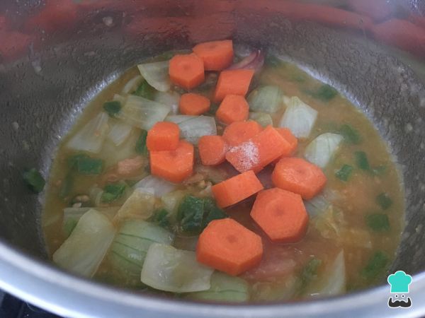 Agregar las zanahorias peladas y cortadas en rodajas no muy finas. Remover.