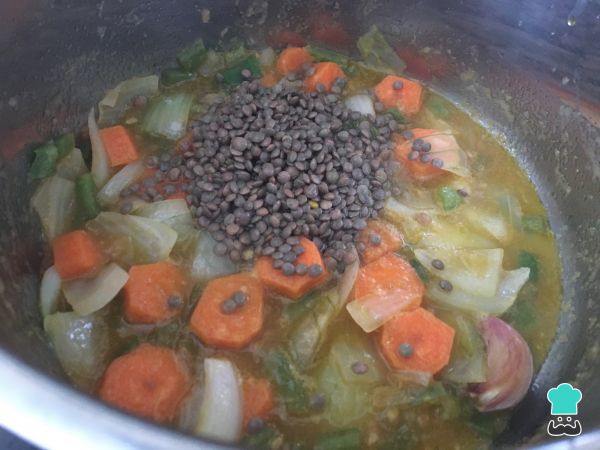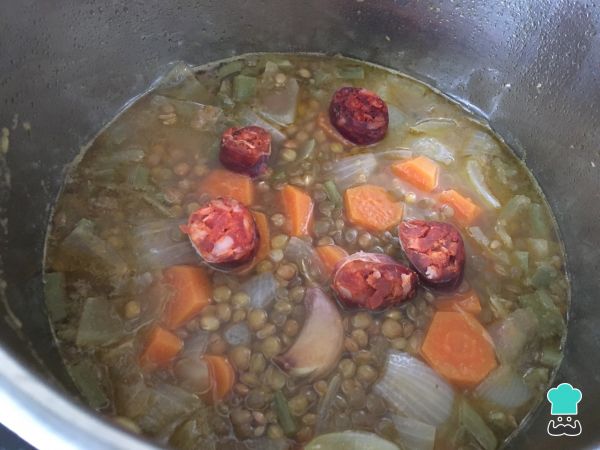 Añadir las lentejas escurridas, cubrir con agua y añadir un poco más de sal. Dejar que se cuezan las lentejas durante 25 minutos aproximadamente.