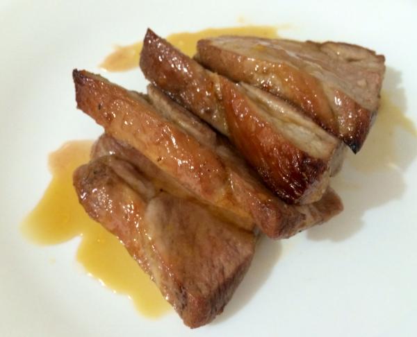7. Cuando esté listo el lomo de cerdo, dejar reposar unos minutos mientras los jugos se asientan. Luego cortar en gruesas rodajas y cubrir con un poco de reducción.