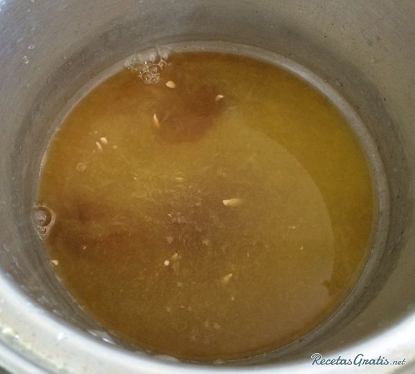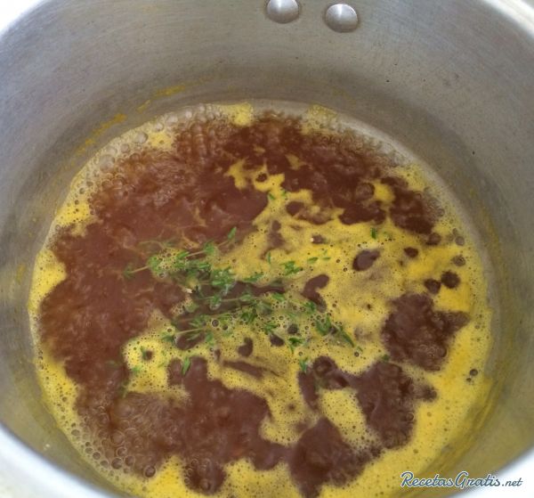 3. Añadir las ramas de tomillo, bajar el fuego y cocinar hasta obtener una consistencia de salsa un poco espesa, cuando la reducción este lista, retirar las ramas de tomillo.