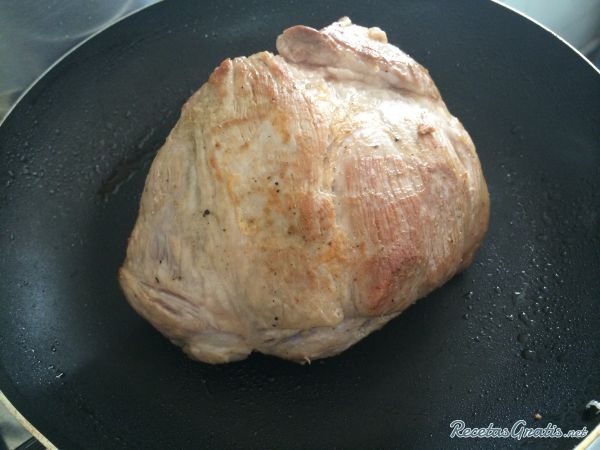 4. Precalentar el horno a 180 gr. Salpimentar por todos los lados el lomo y sellar en una sartén caliente con un poco de aceite, cuando este dorado, retirar del fuego.