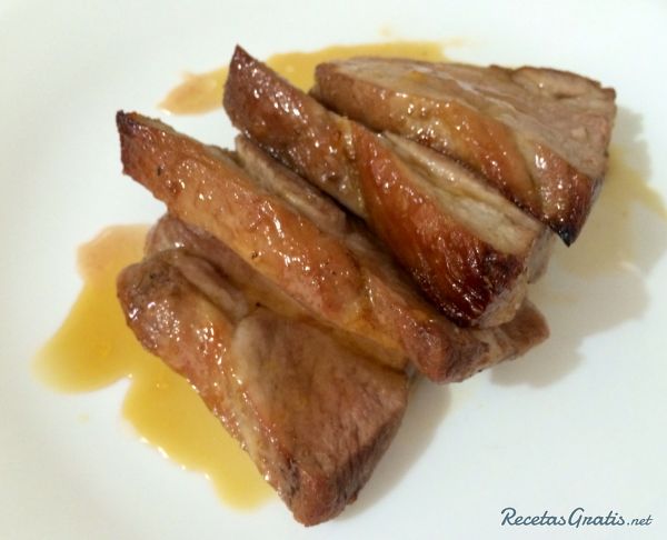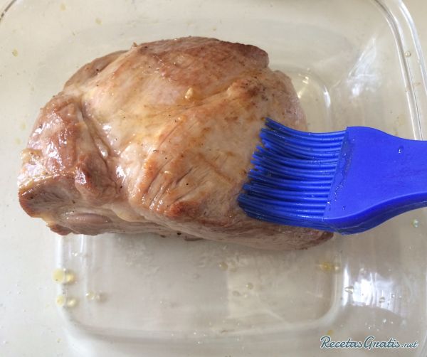 5. Llevar el lomo de cerdo a una fuente y con una brocha untar por todos lados con la reducción de naranja. Hornear 45 minutos.