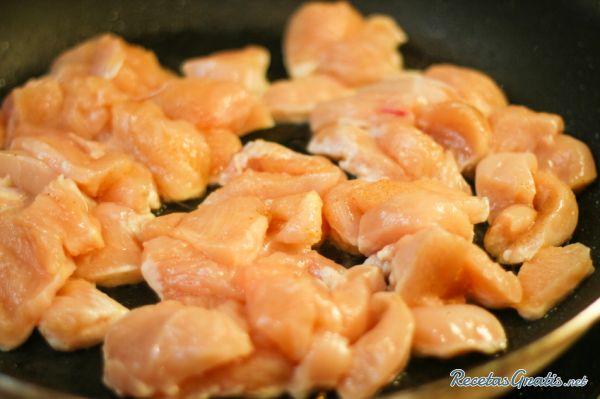 5. Cuando la cebolla se vuelva transparente, agrega los trozos de pollo y sigue cocinando moviendo constantemente con una cuchara de madera.