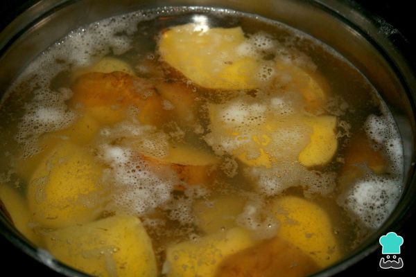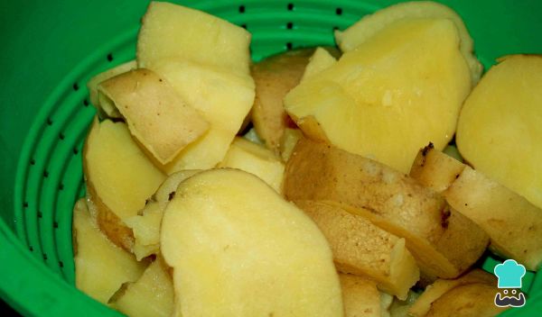 Cuando las papas estén blandas, escurre el agua en un colador. Abre el grifo y deja correr un poco de agua fría sobre ellas, sólo un poco. Aprovecha que la papa está caliente y tritura el puré, será más fácil.