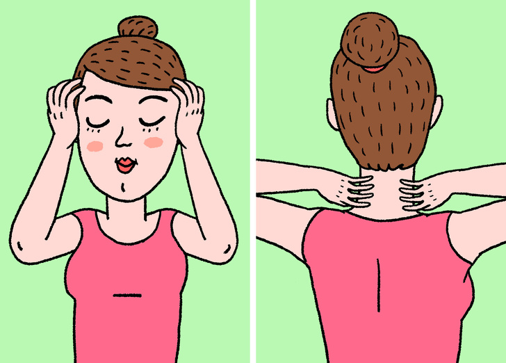 En una posición recta, comienza a golpear tu cabeza con los dedos de ambas manos, dirigiéndote desde la frente hacia la nuca. Haz énfasis en la zona de las sienes, coronilla y el cuello en la zona del crecimiento del cabello. Tienes que hacer 10 círculos: sienes, frente, coronilla y cuello, o 30 golpecitos en cada uno de los puntos. Sigue frotándolos hasta que se enrojezcan levemente.