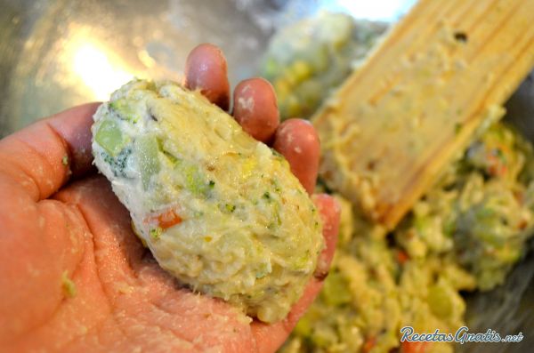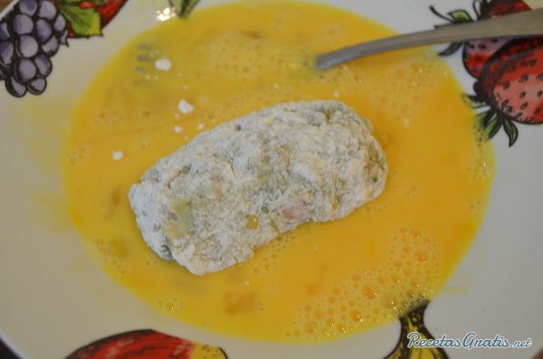 8. Cuando la masa esté fría, corta trozos y haz pequeñas croquetas. Pásalas por harina, huevo y pan molido.