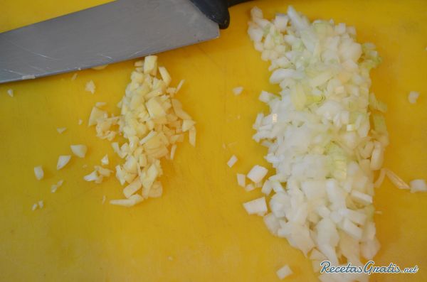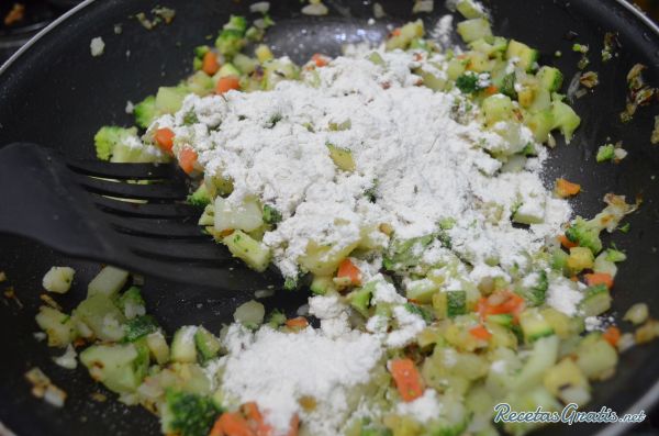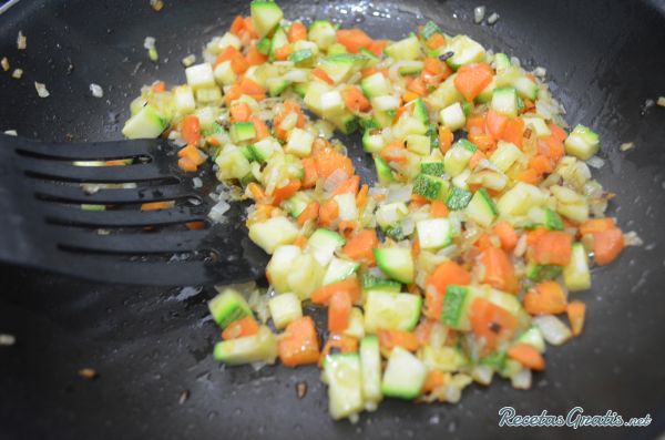 3. Pon la cebolla y el ajo en una sartén con aceite ya caliente. Agrega el resto de las verduras, sazona y cocina todo junto por 5 minutos.