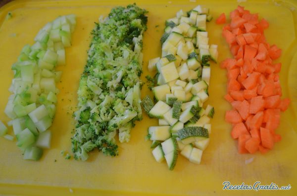 2. Pica el resto de las verduras en pequeños cuadrados. Para blanquear el brócoli y chayote solo basta sumergirlos 3 o 5 minutos en agua hirviendo con sal.