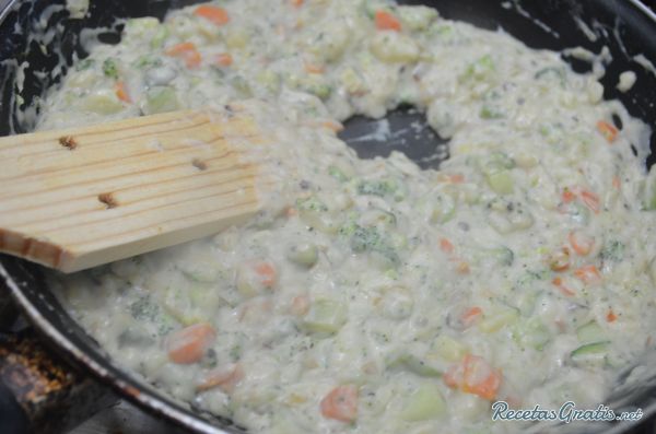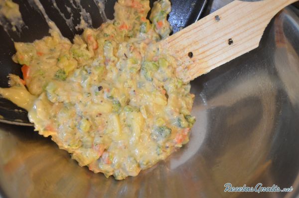 7. Ralla encima queso, mezcla bien y pasa la masa a una fuente previamente engrasada. Deja que se enfríe y tome temperatura ambiente.