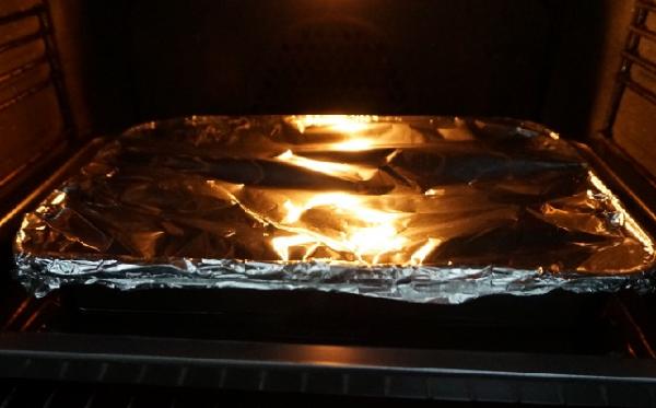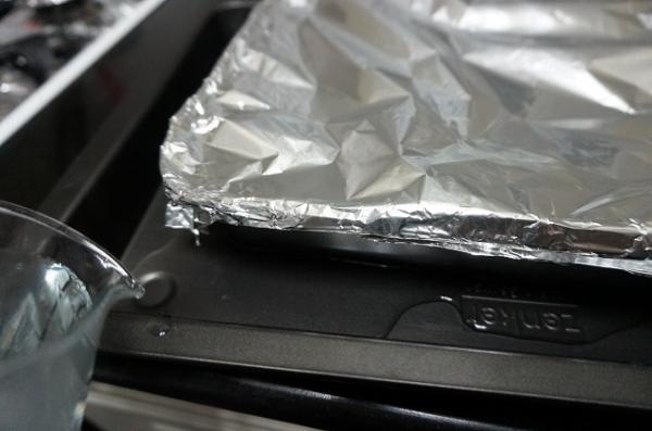 9. Cubrir la bandeja con papel de aluminio sellando bien los bordes para que no entre agua. Ponemos la bandeja encima de otra fuente más grande con agua caliente. El agua debe quedar hasta un poco menos de la mitad de la bandeja del tocinillo, esto será el baño María.
