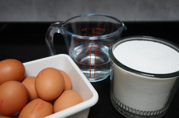 1. Prepara todos los ingredientes, los huevos, el agua y el azúcar.