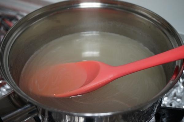 2. Preparar el almíbar poniendo el agua y el azúcar en un olla a fuego medio hasta que quede todo el azúcar disuelto.