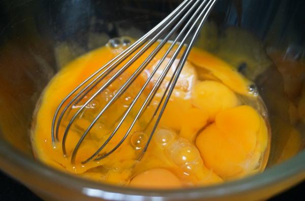 3. En un recipiente ponemos las yemas y los huevos. Batimos.