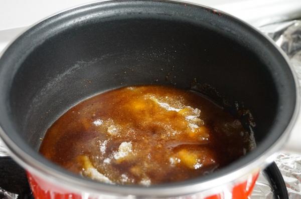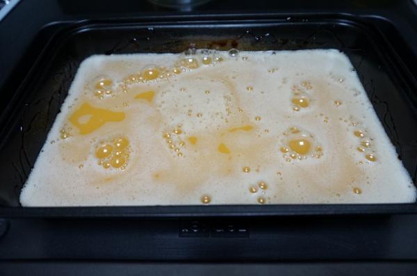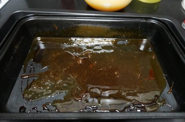 7. Cubrir el fondo de una bandeja para horno con el caramelo líquido.