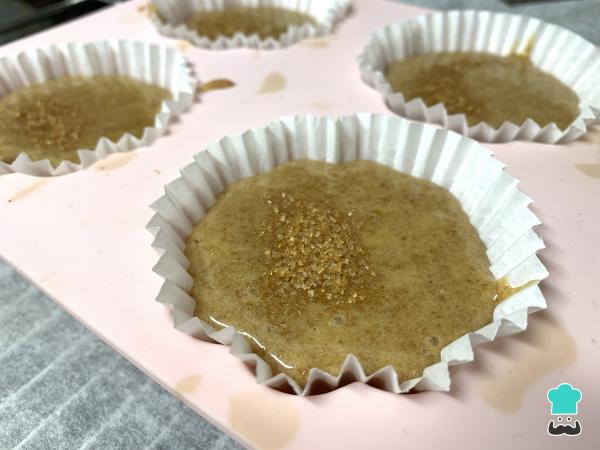 Si lo deseas puedes espolvorear azúcar morena encima, agregar trozos de chocolate o nueces. Hornea las magdalenas por 20 minutos, aunque esto puede variar dependiendo del horno.