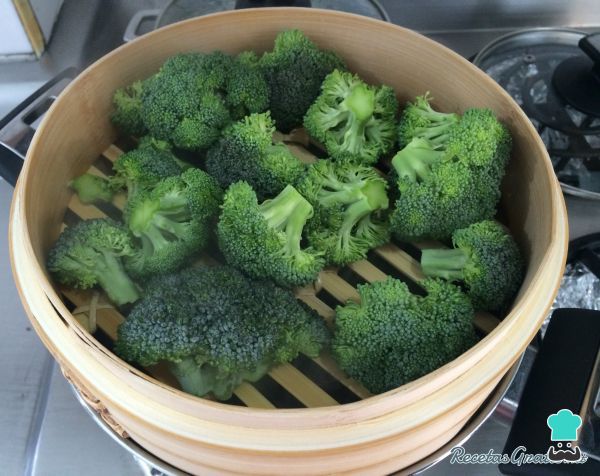 Cocer el brócoli al vapor durante unos 8-10 minutos aproximadamente en una vaporera metálica o de bambú, o si no tienes nada de eso, puedes poner un colador encima de una olla con agua hirviendo para que la verdura se cocine con el vapor del agua hirviendo. Asegúrate de lavar bien el brócoli primero, para quitar cualquier resto de tierra y luego se debe partir o cortar en arbolitos para que se haga antes.