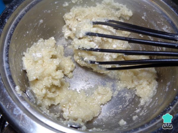 Cuando empiece a hervir el agua añadimos la harina de trigo poco a poco mientras vamos mezclando y mezclamos hasta que la masa de los churros caseros comience a despegarse de las paredes de la cacerola. Esto lo hacemos a fuego bajo.