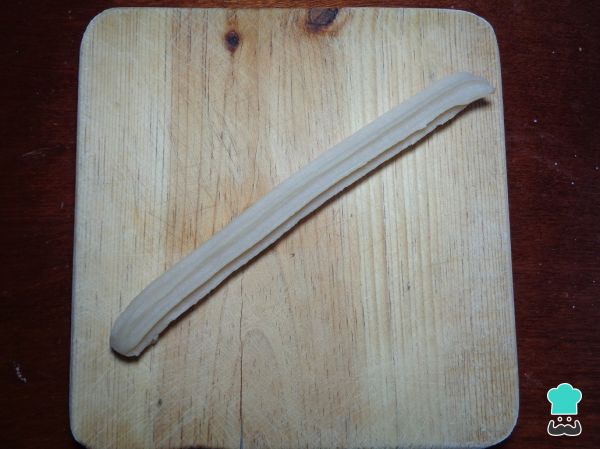Para formar nuestro churro casero ponemos la masa dentro de una bolsa o manga pastelera, con una boquilla en forma de estrella ancha y apretamos hasta que se forme.