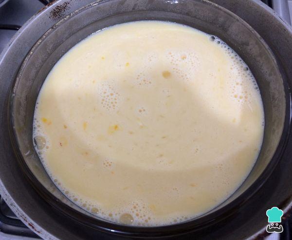 Cuando lo tengas, pon el caramelo casero en la base del molde, preferiblemente metálico o de cristal. Luego, debes verter la mezcla anterior encima. Poner el molde con la preparación del flan de leche condensada y huevo sobre una bandeja con borde alto. Añadir agua hasta alcanzar la mitad del molde para hacer el flan de leche al baño María.