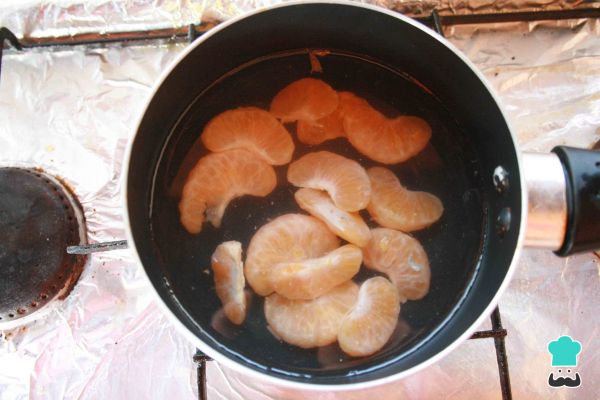 2. Hierve agua y coloca las mandarinas. Cocina por 5 minutos, retira del fuego, cuela y desecha el agua. Realiza este paso 3 veces y reserva.