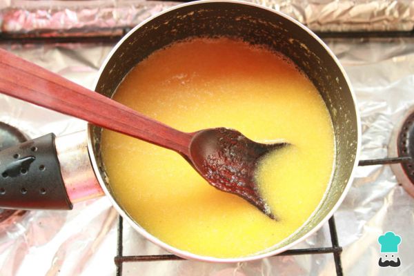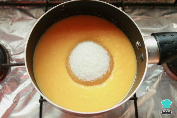 4. Dentro de una olla vierte el zumo de mandarina y el limón, remueve. Agrega el azúcar.