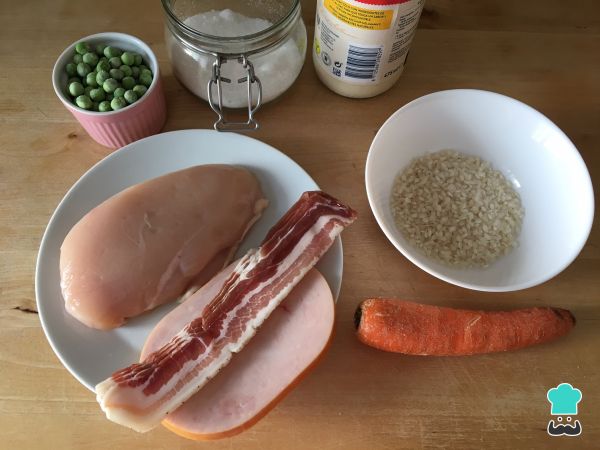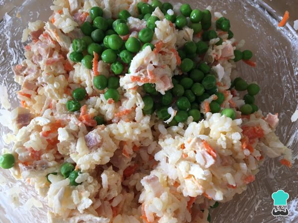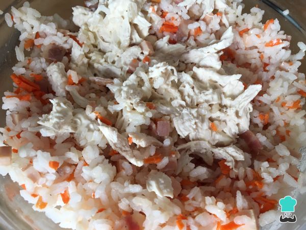 5. Mezclar todos los ingredientes de esta forma: arroz, pollo, zanahoria, jamón dulce y bacon. Salpimentar a gusto.