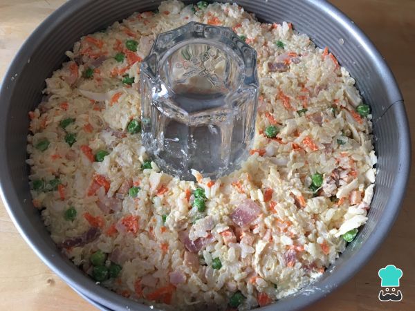 Poner el relleno para el pastel de arroz en un recipiente con forma de rosca y mantener en la nevera por 30 minutos.