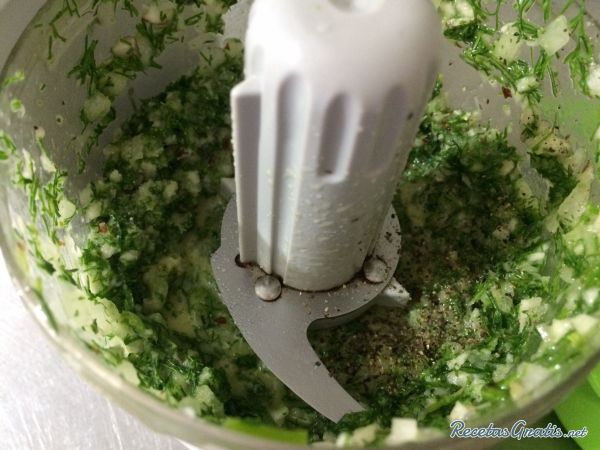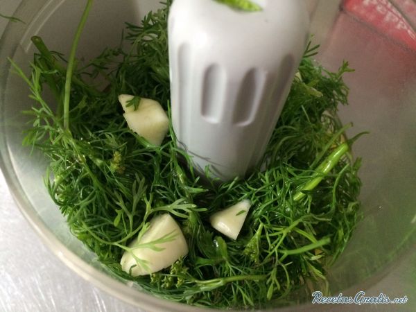 En una procesadora de alimentos agregamos el ajo, el cilantro, un chorro de agua y aceite de oliva, y licuamos durante unos minutos.