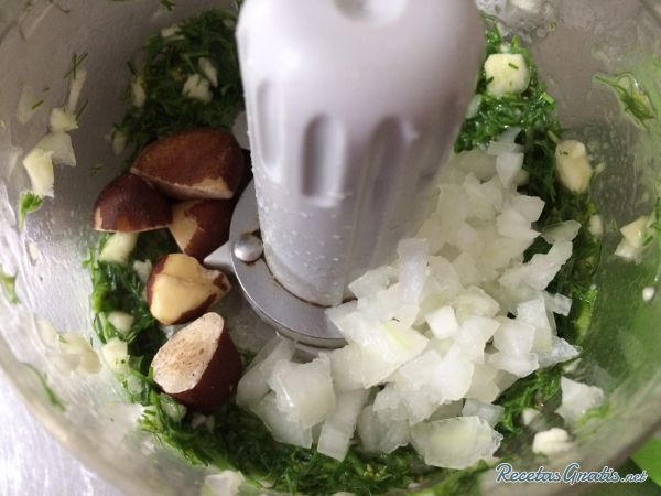 Luego agregamos la cebolla cortada en cubos y las nueces. volvemos a procesar hasta obtener una consistencia homogénea.