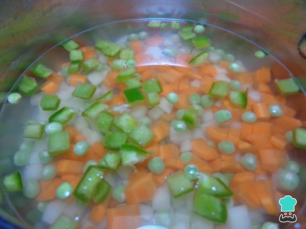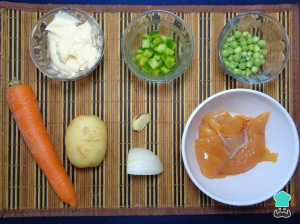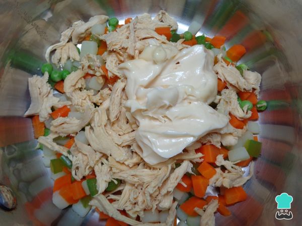 Una vez cocinadas las verduras, colarlas y ponerlas en un recipiente, agregar el pollo desmenuzado y poco a poco incorporar la mayonesa hasta tener una consistencia adecuada.