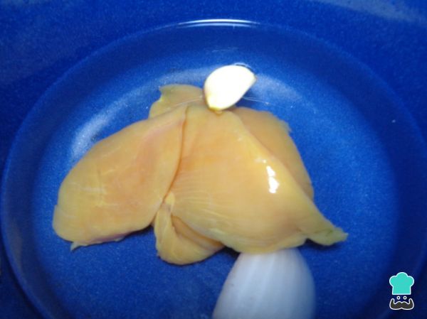 En una olla, poner la pechuga previamente lavada, agregar un poco de sal, cebolla y ajo, y dejar que hierva durante 25 minutos o hasta que el pollo esté perfectamente cocido. Una vez listo, dejar enfriar y desmenuzar la carne en pedazos pequeños.