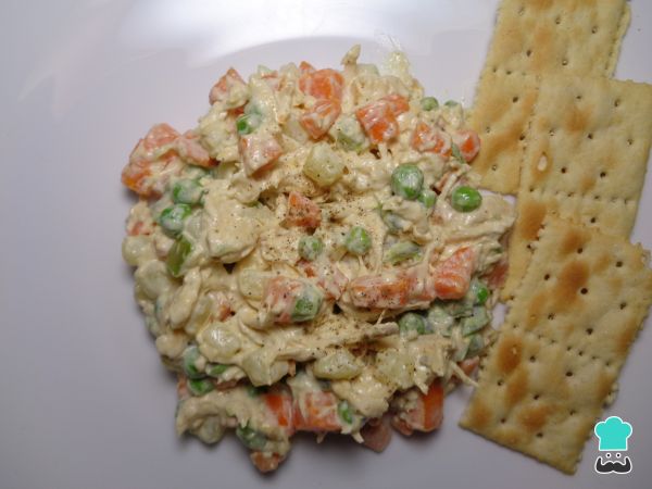 Finalmente, salpimentar y servir la ensaladilla rusa con pollo acompañada de unas galletas saladas de queso. ¡