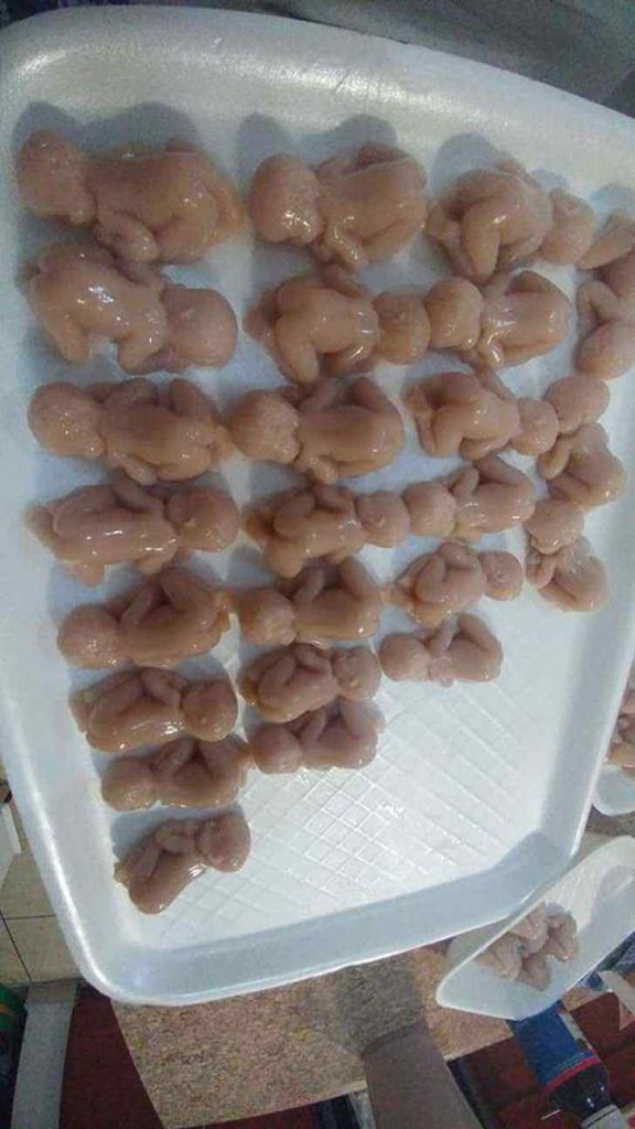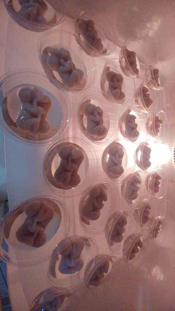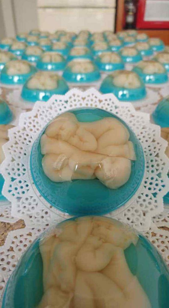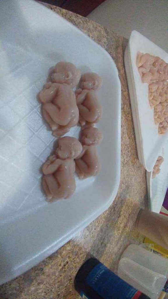Primero se hacen los fetos en un molde y luego se une a dos para añadirles gelatina transparente.