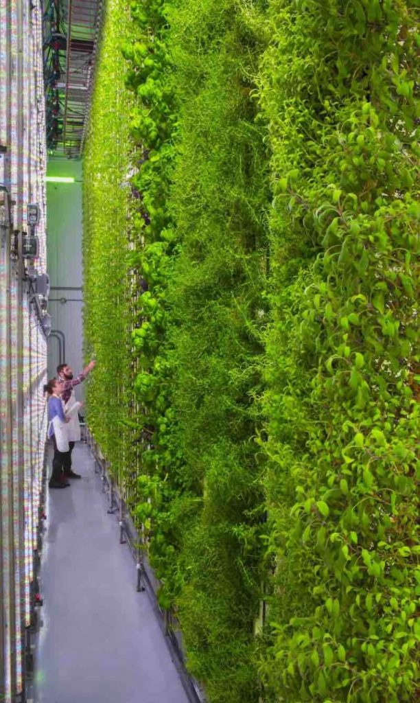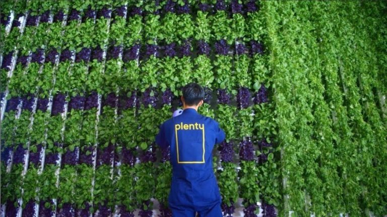 La granja interior climatizada de Plenty tiene hileras de plantas que crecen de forma vertical, posee luces LED que imitan al sol y que son movidas por robots, mientras la inteligencia artificial maneja variables como luz, agua, temperatura y optimiza las cosechas.