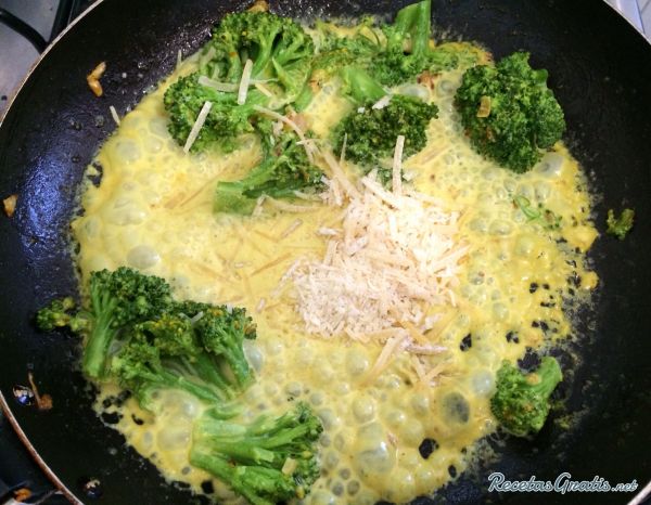 Ahora agrega la crema de leche, mezcla todo y baja el fuego cuando esté hirviendo. Entonces añade el queso parmesano, cocina por 3 minutos y luego rectifica el sabor con sal y pimienta.
