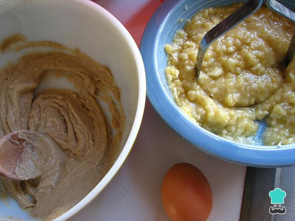 Vierte los plátanos en un recipiente profundo y amásalos hasta que quede como una pasta o puré. Añade la taza de harina y mezcla bien. Luego agrega los huevos, la mantequilla y el polvo de hornear, siempre mezclando bien y hasta integrar todos los ingredientes.
