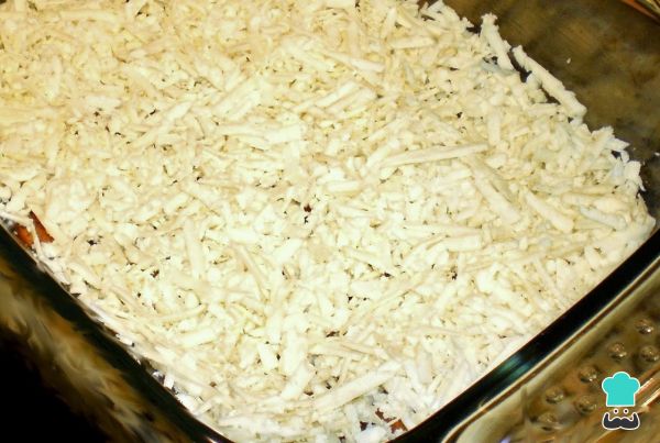 Con la mezcla lista, agrega el azúcar hasta que quede un poco dulce. Pon toda la mezcla en un molde y cúbrela con una capa de queso rallado. El queso tiene que ser blanco y salado (puede ser cualquier variedad de queso fresco siempre que no sea muy húmedo, o incluso queso mozarella).