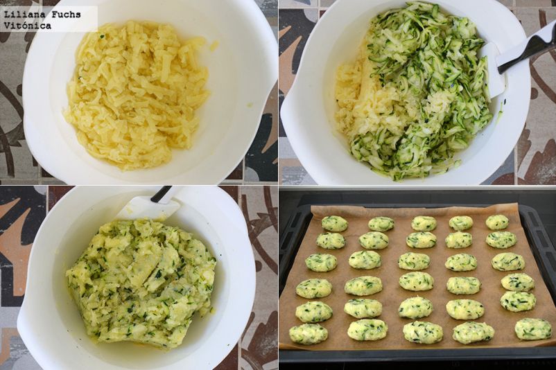 Si la masa estuviera muy húmeda podemos dejarla escurriendo sobre un paño limpio en la nevera durante media hora. Con el frío además será más manejable. Con una cucharilla tomar porciones y formar pequeñas croquetas. Distribuir en la bandeja de horno, pincelar con un poco de aceite y hornear hasta que estén dorados, unos 30 minutos.
