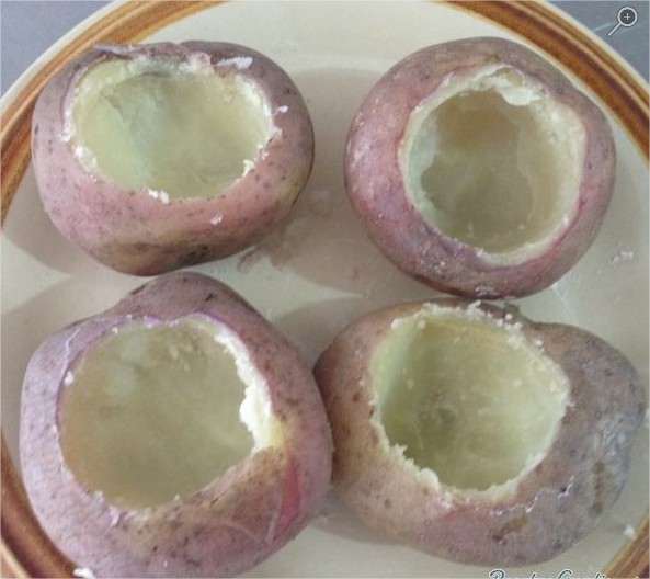Con una cuchara pequeña, abrir una cavidad y reservar la pulpa de las papas.