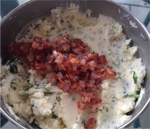 Agregar la cebolla y el tocino al puré, mezclar y rectificar sabor con sal y pimienta.