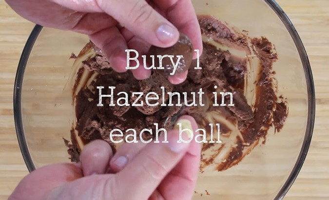 Lleva la mezcla al congelador durante 1 hora para que se endurezca. Pasado el tiempo, forma pequeñas bolitas introduciendo una avellana entera en el centro. Llévalas nuevamente al congelador por 10 minutos.