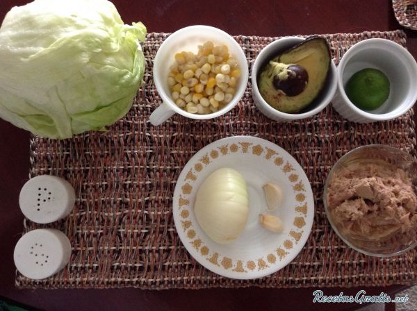 Primero, debes alistar todos los ingredientes en la mesa de trabajo. Te recomendamos usar atún en agua para no aportar calorías a la receta pero si prefieres puedes usar atún en aceite de oliva.