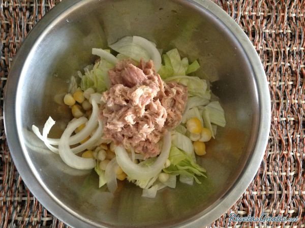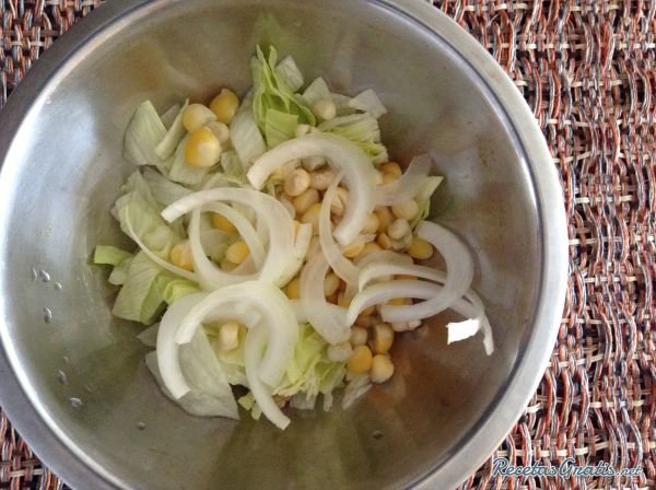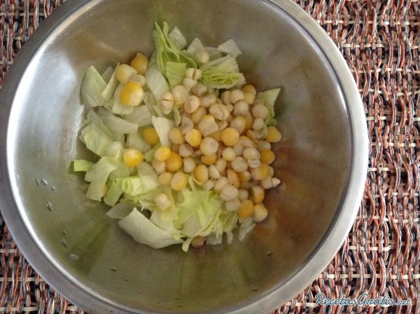 Lavar y cortar la lechuga con la mano. Luego ponerla en un bol de ensaladera y mezclar con el maíz. Recuerda lavar muy bien la lechuga y cortarla con la mano o con un cuchillo de plástico para evitar que se oxide.