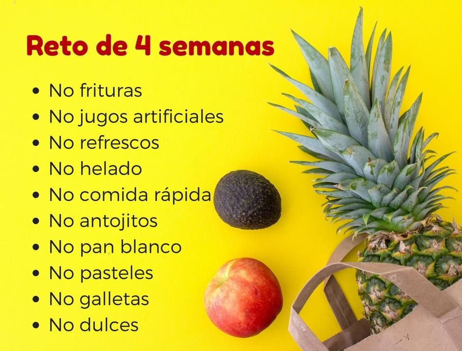 Este reto de las 4 semanas comiendo sano consiste en dejar de comer frituras, dulces, bebidas artificiales y cualquier alimento que sea completamente dañino para tu organismo. En lugar de todo esto debes consumir solo vegetales, dulces naturales como as frutas y las bebidas saludables.