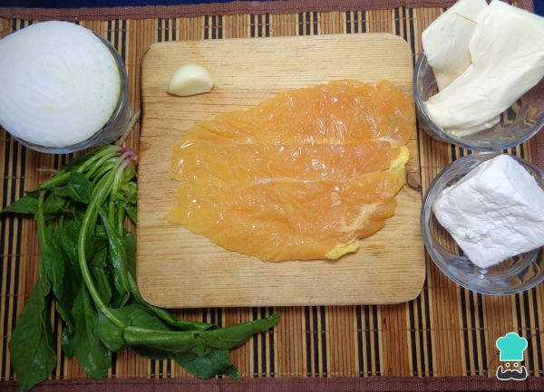 Primero, se deben reunir los ingredientes que necesitaremos para la preparación de estas deliciosas pechugas rellenas de queso crema y espinacas.