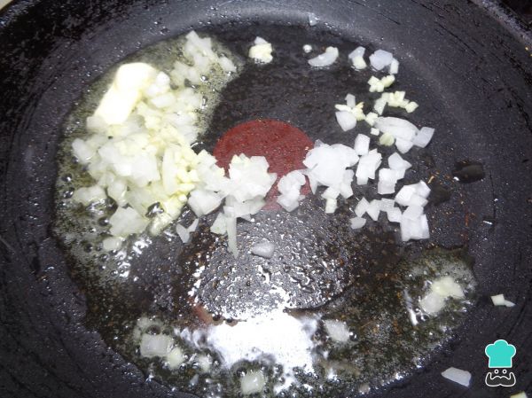 Se debe comenzar picando finamente la cebolla y el ajo. Una vez listos los colocamos en un sartén caliente donde derretimos la mantequilla y los dejamos sofreír hasta que la cebolla se observe transparente. También añadimos una pizca de sal y pimienta.