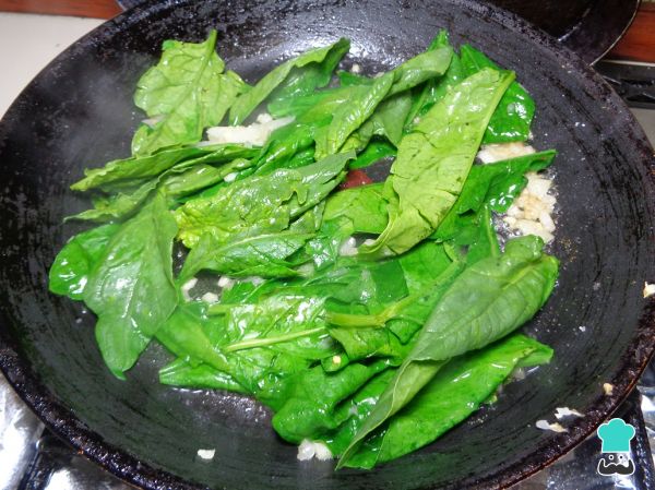 Cuando esté lista la cebolla, tomamos las hojas de espinaca limpias y desinfectadas y las añadimos al sartén. Dejamos que se guisen junto con la cebolla y el ajo hasta que estén muy suaves.
