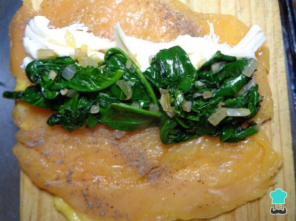 A parte, tomamos las pechugas de pollo y las salpimentamos perfectamente bien de los dos lados de cada pechuga. Ahora le colocamos un poco de queso crema, queso de hebra y un poco de nuestro guiso de espinacas en el centro. Entonces enrollamos las pechugas con espinacas y crema de queso y las cerramos con ayuda de algunos palillos si es que tienen, si no solo la enrollamos cuidando que no se salga el relleno.