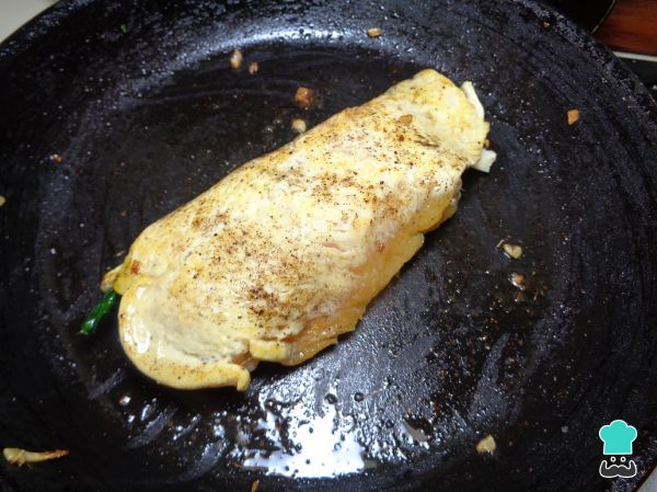 Cuando esté formada nuestra pechuga relleno de espinacas lo colocamos en un sartén caliente y sellamos toda la superficie del pollo. Una vez sellado, llevamos las pechugas rellenas de espinacas a hornear por 10 minutos a 180° C.
